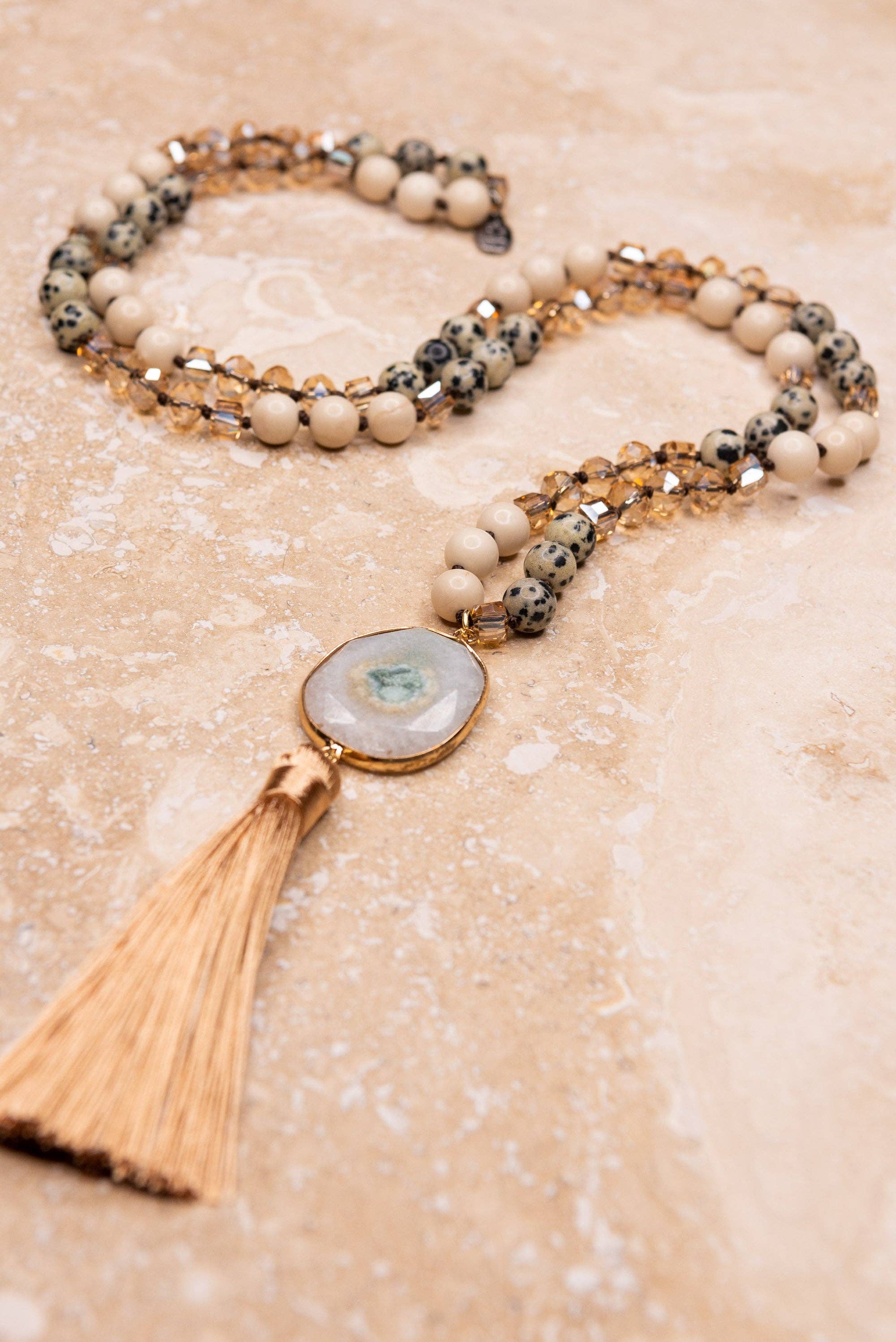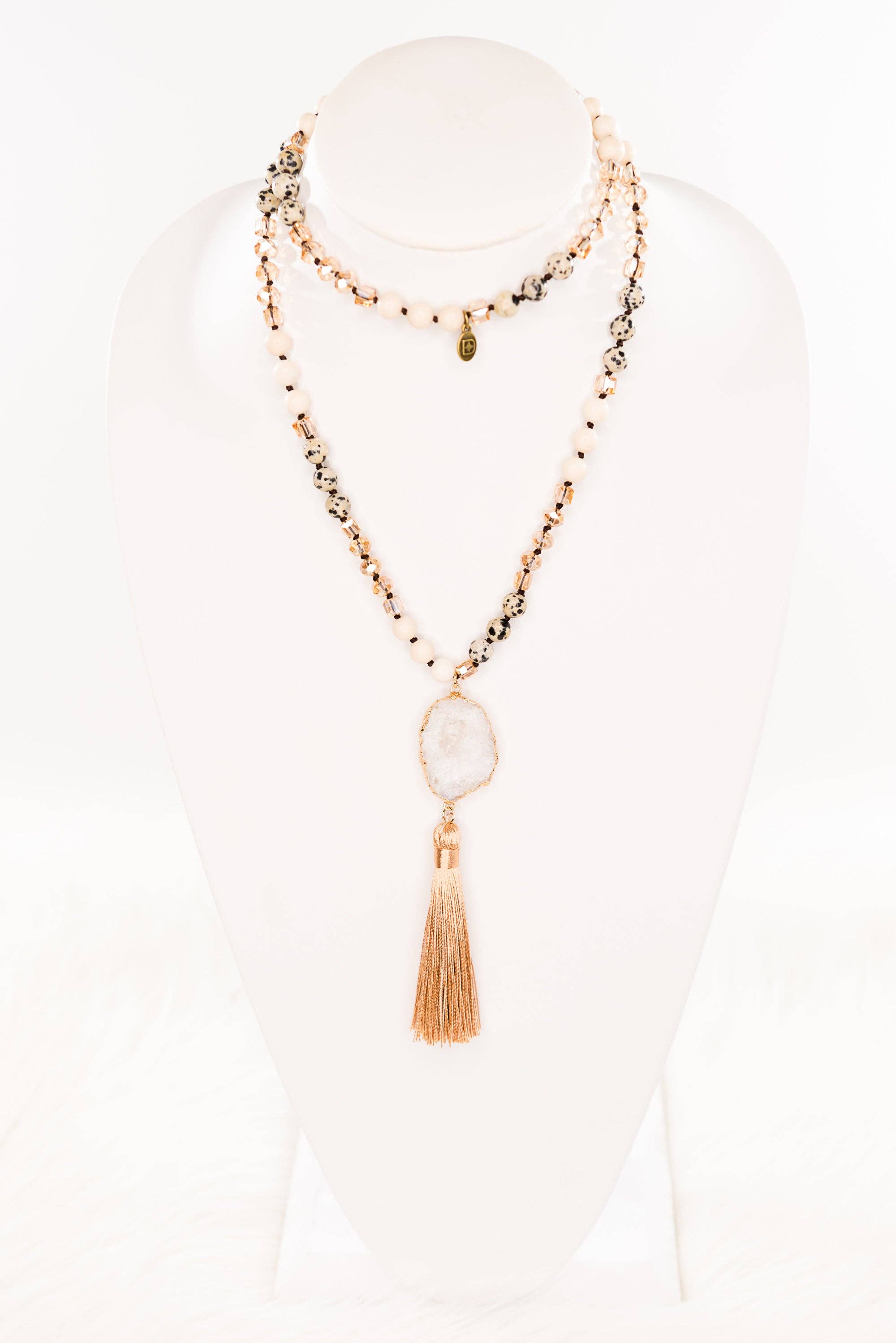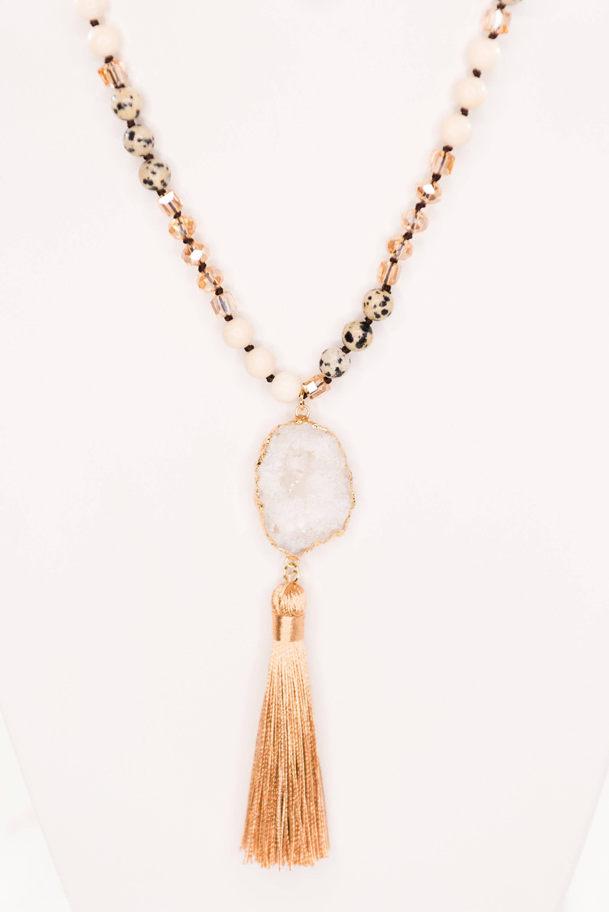 Long, crystal and natural stone beaded necklace with stone pendant and yarn tassel. 22" length Due to the natural materials used in Dylan Thomason jewelry, please expect some variation in color and/or texture.