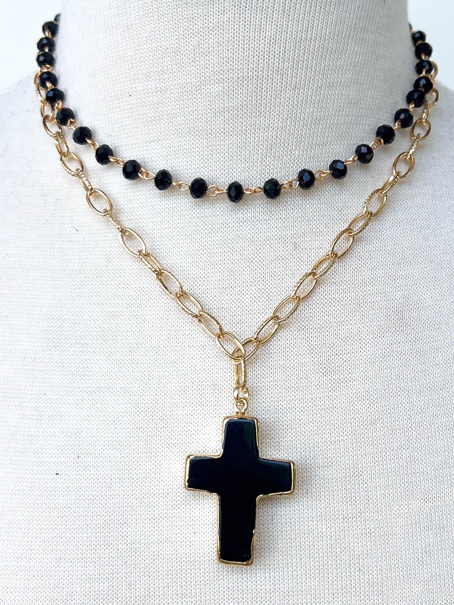 Double layer necklace featuring beautiful small stone cross. Cross dangles from gold chain link layer. Second layer features gold and natural toned beads