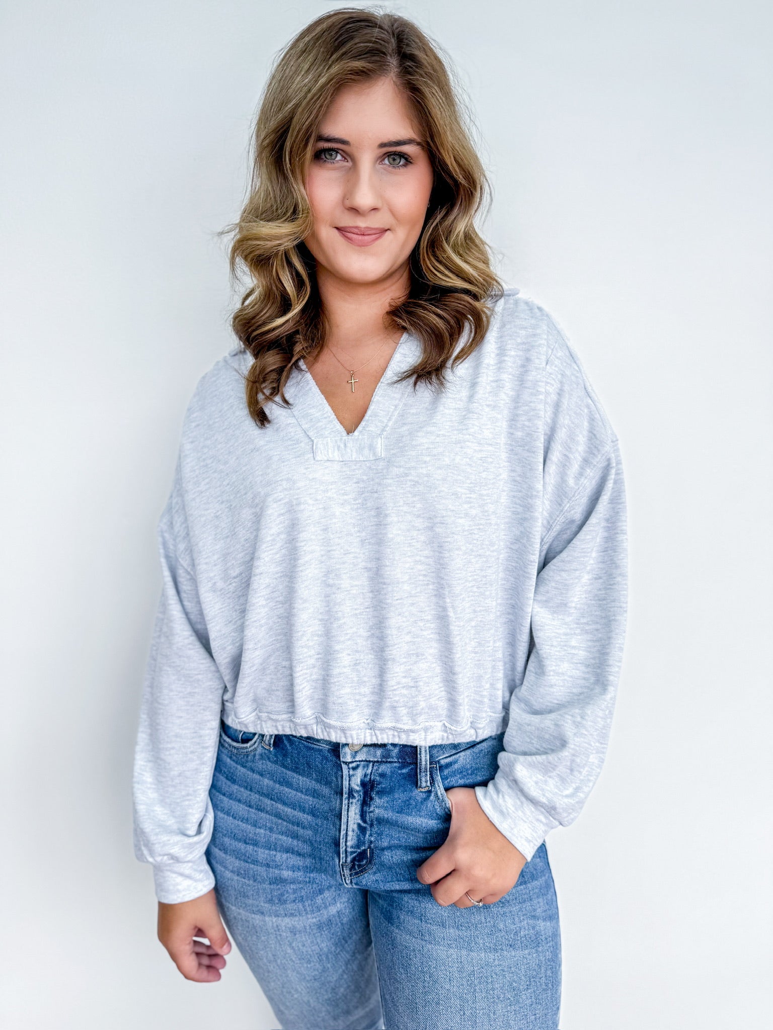 The Cloud Harbor Top is your new go-to for effortless comfort with a playful twist. Crafted from soft cotton terry fabric, it features a relaxed slouchy fit, long sleeves finished with cozy banded cuffs, and a casual raw hem. The flattering v-neckline and subtle collar add just the right amount of charm to this easy-to-wear favorite. Perfect for easy days or layering up with attitude! Â
