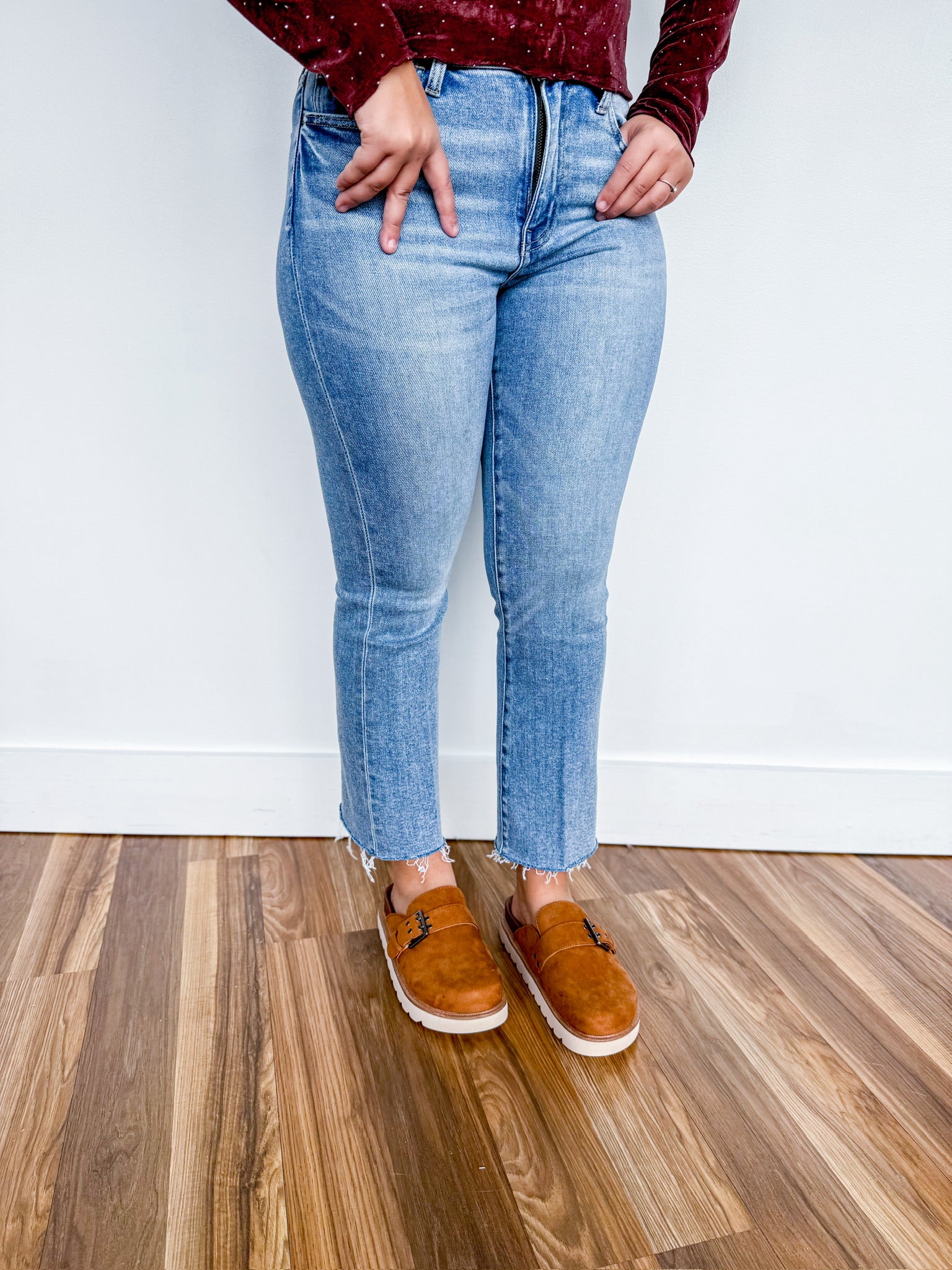 Step into style and comfort with the Flying Monkey High Rise Raw Hem Kick Flare Jeans. Made from comfy stretch denim, these jeans hug your waist with a flattering high rise and feature a trendy raw hem for that effortlessly cool vibe. The cropped length and flared leg opening add a playful twist to your look. With a 10 3/8" rise, 27" inseam, and 17" leg opening, these jeans are perfect for showing off your favorite boots or sneakers while keeping you comfortable all day long.