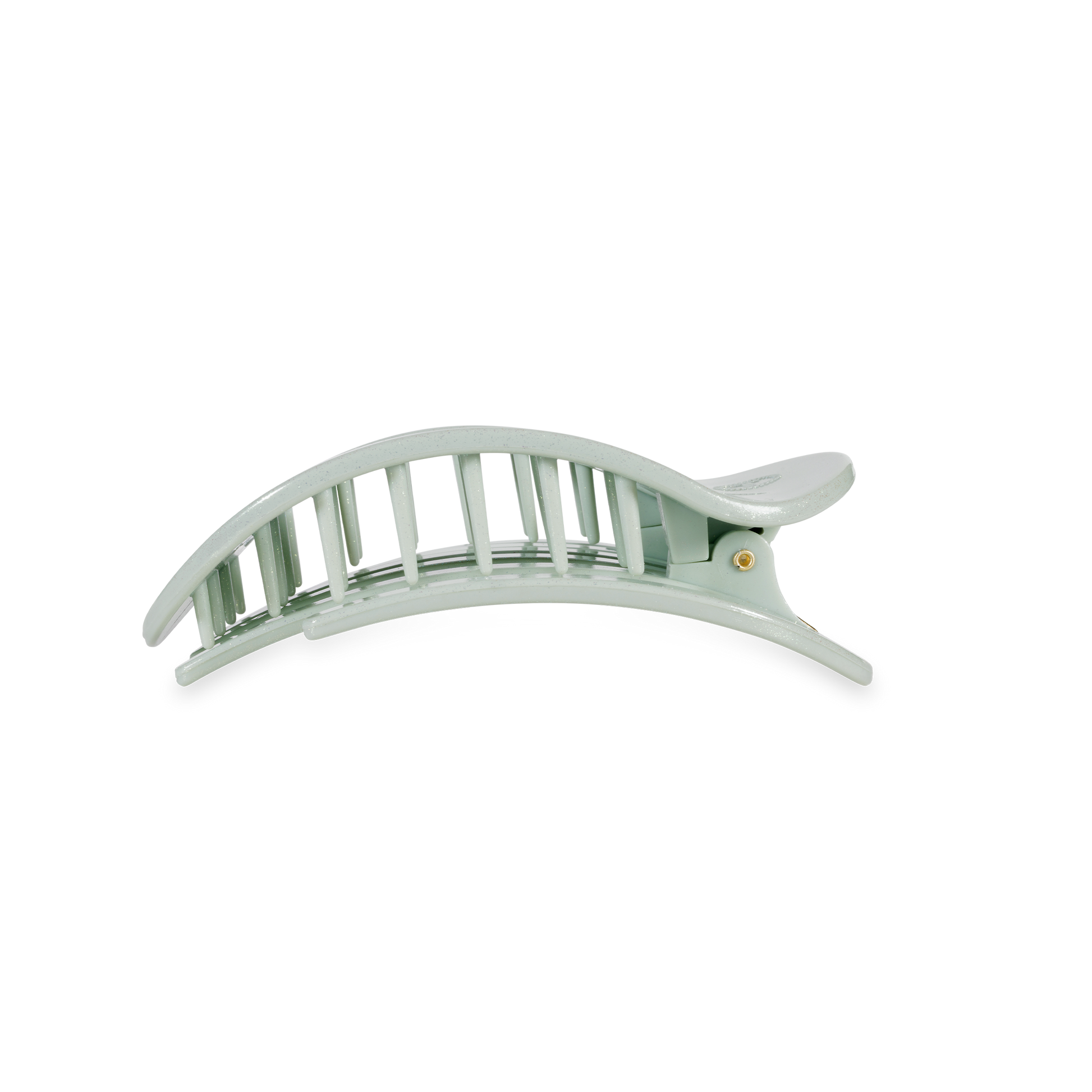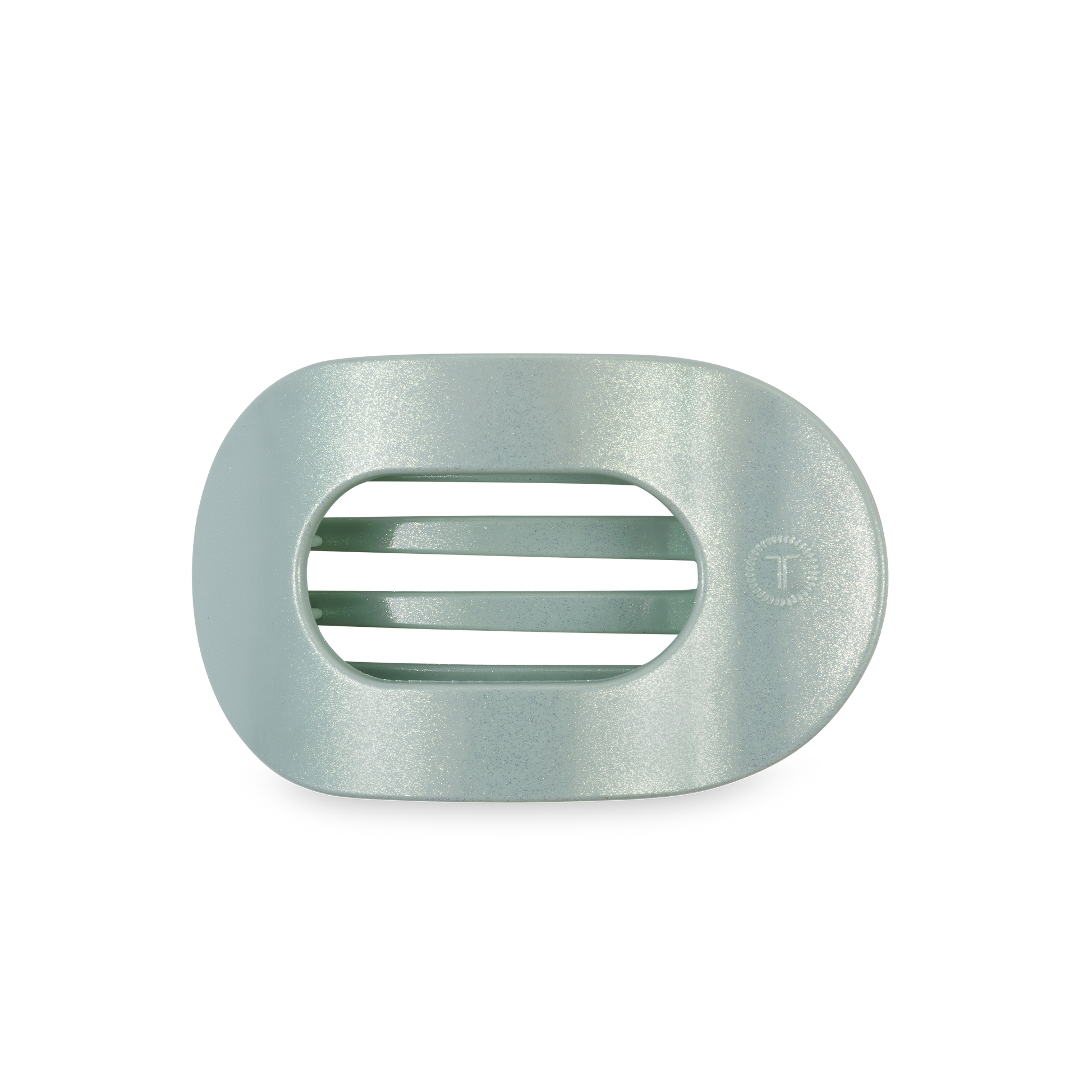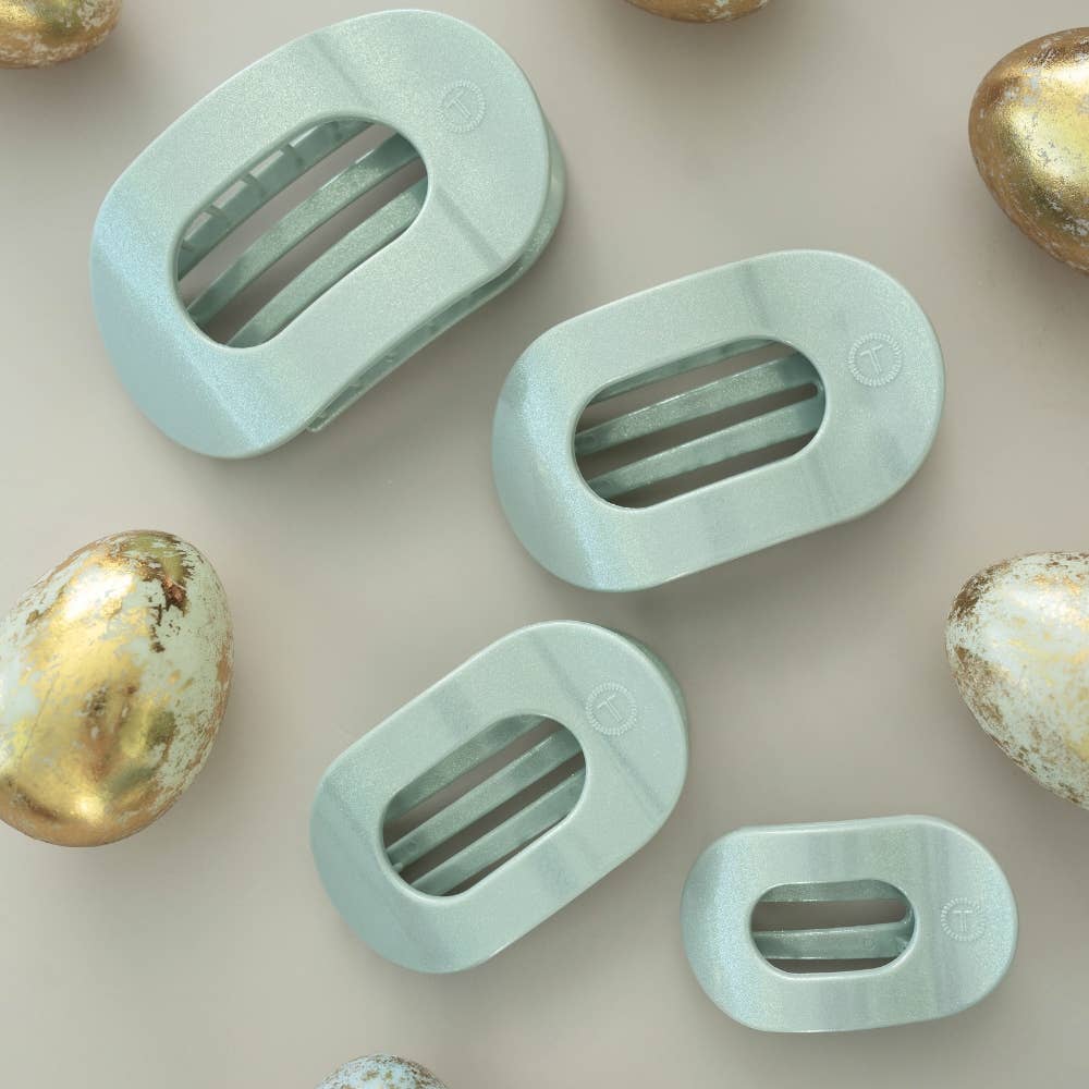 Lay flat and relax with the new TELETIES Dew Drop Medium Flat Round Hair Clip in Shimmering Green. This hair clip is designed to allow you to lay back flat, do yoga, or sit comfortably in a seat with a headrest, and it is made with the same material that is nearly unbreakable.
