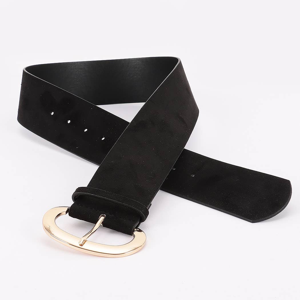 * This is a wide - structured belt. It has a smooth, soft - textured strap that made of a suede. The belt features a prominent, oval - shaped metal buckle which adds a touch of elegance and sophistication. The strap is designed with evenly spaced holes for adjusting the fit. From H&D Accessories, this belt can serve as a stylish accessory to cinch the waist of various outfits, whether it's a dress, a blouse paired with trousers, or a coat, enhancing the overall look with a blend of classic and contemporary charm.
